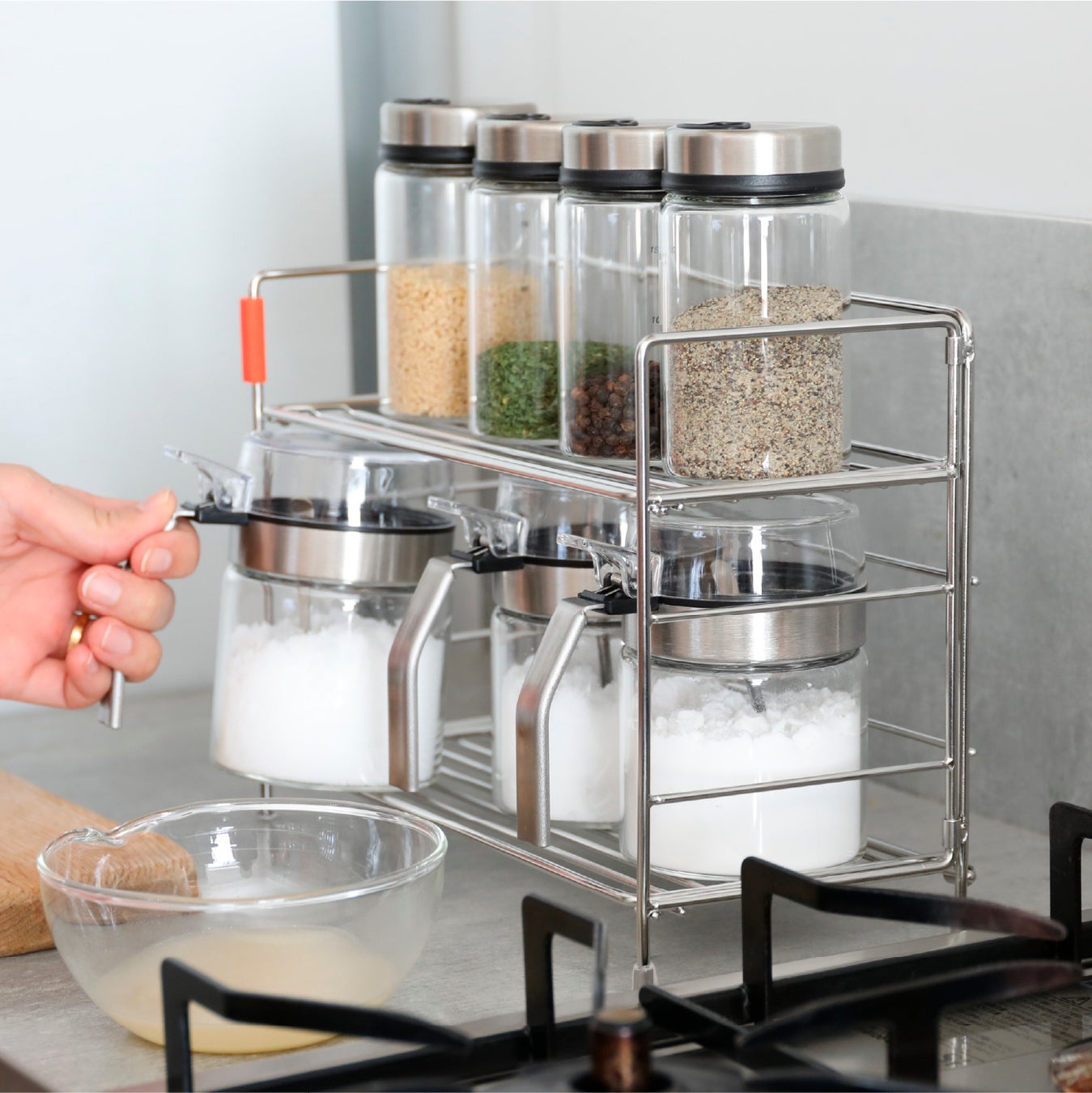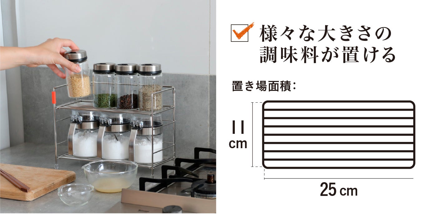 スパイスボトルや調味料の高さが異なっても、2段使いにすれば見やすく、取り出しやすい。