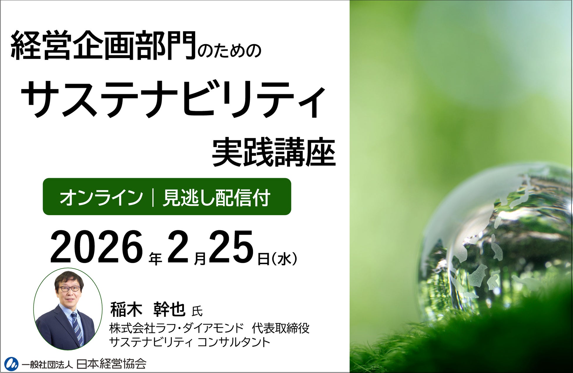 一般社団法人日本経営協会(所在地:東京都渋谷区、会長:高配 豪久)は、2026年2月25日(水)に、オンラインセミナー「経営企画部門のためのサステナビリティ経営実践講座~理念を経営計画に、計画を行動へ、経営を動かす設計力を磨く~」を開催いたします。