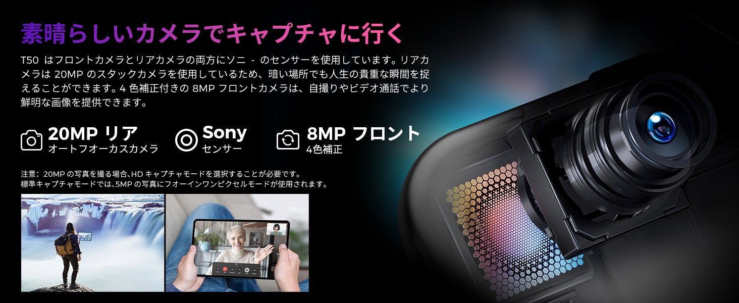 Teclast「T50」のフロントカメラとリアカメラの両方にソニーセンサーを使用しています。リアカメラは20MPのスタックカメラを使用しているため、暗い場所でも人生の貴重な瞬間をキャッチすることができます。また、BDS、GPS、GLONASSとGalileoの四つの主要な衛星ナビゲーションシステム全てをサポートし、A-GPSインターネット支援測位をサポートして、より高速で正確な位置を提供できます。
