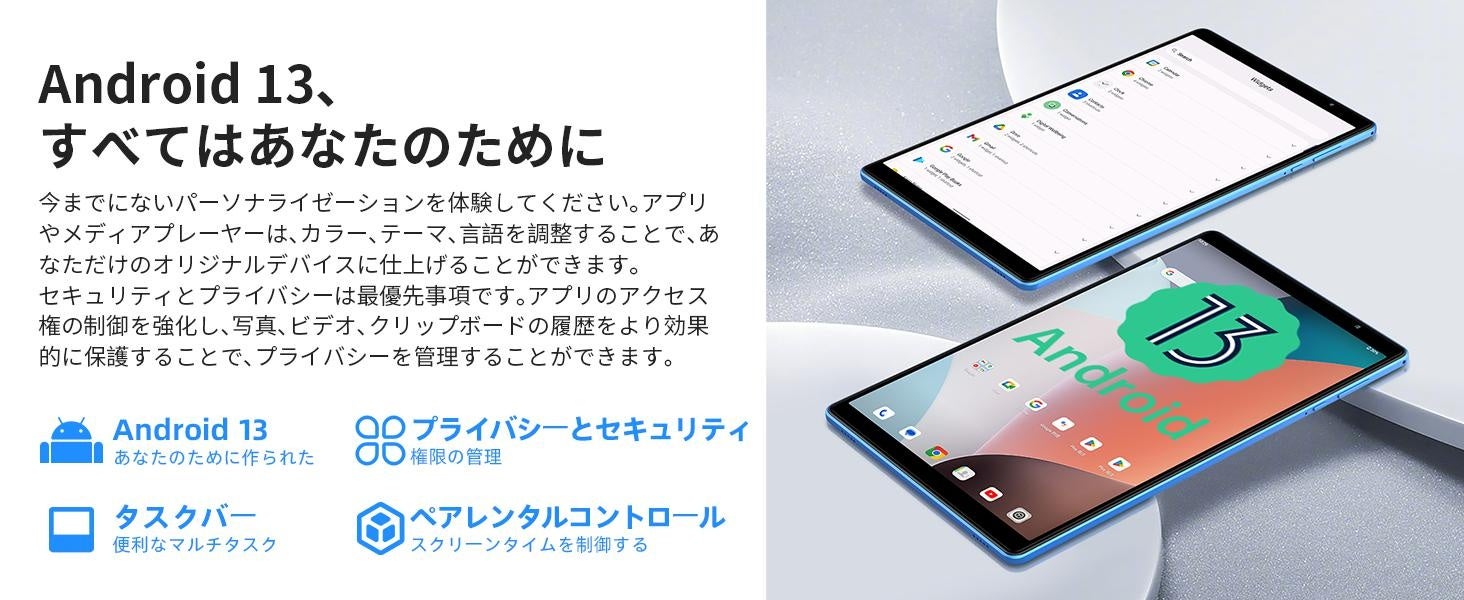 10インチ / Android 13 / 8GB(4+4GB拡張)RAM+64GB ROM+1TB拡張 / WideVine L1対応 / WiFiモデル / デュアルカメラ / 画面分割 / 3.5mmヘッドフォンジャック / 児童守護