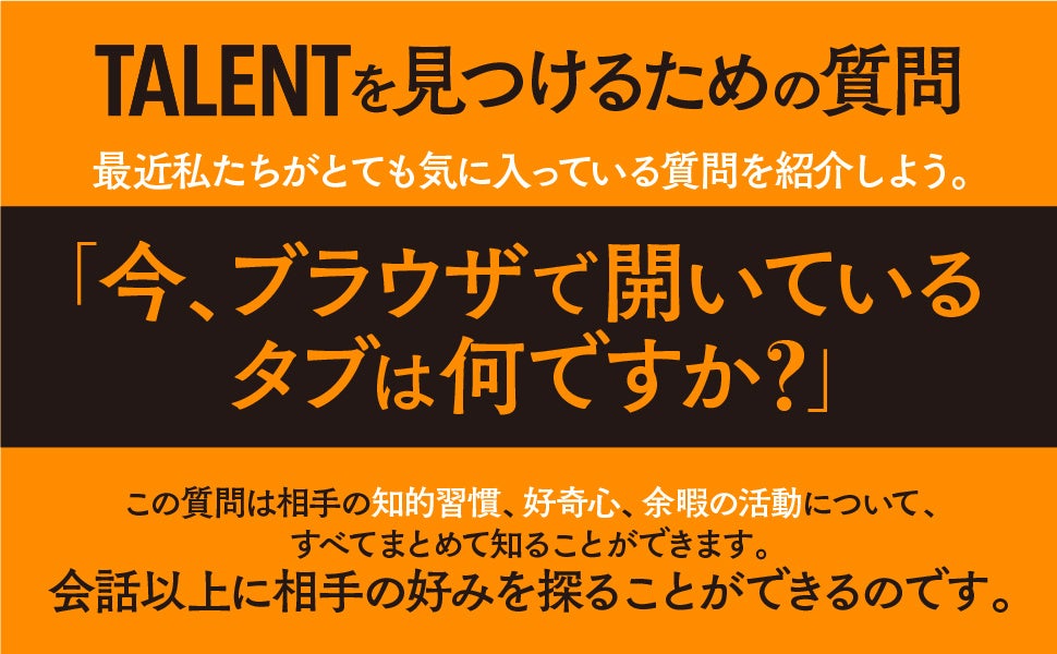 この本では、著者たちの試行錯誤によってたどり着いた「良い人材=TALENT」を見つけるための質問例を数多く用意しています。本書を通して、人材採用をより身近に感じ、これからの企業発展に役立てていただければ幸いです。
