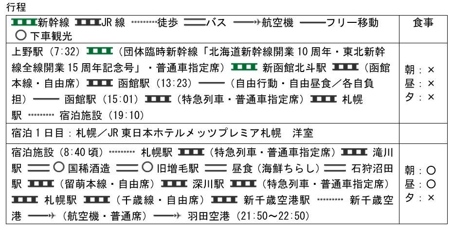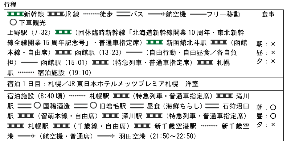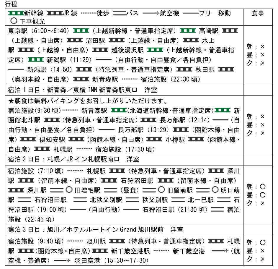 日本海に沿って本州・北海道を北上いたします。沼田駅から石狩沼田駅までは、上越線上越国境や函館本線山線など、本数の少ないローカル区間にご乗車いただきます。さらに、「いなほ」「北斗」「宗谷」など、多種多様な列車を乗り継ぎながら、日本海に沿ってゆっくりと北上していきます。