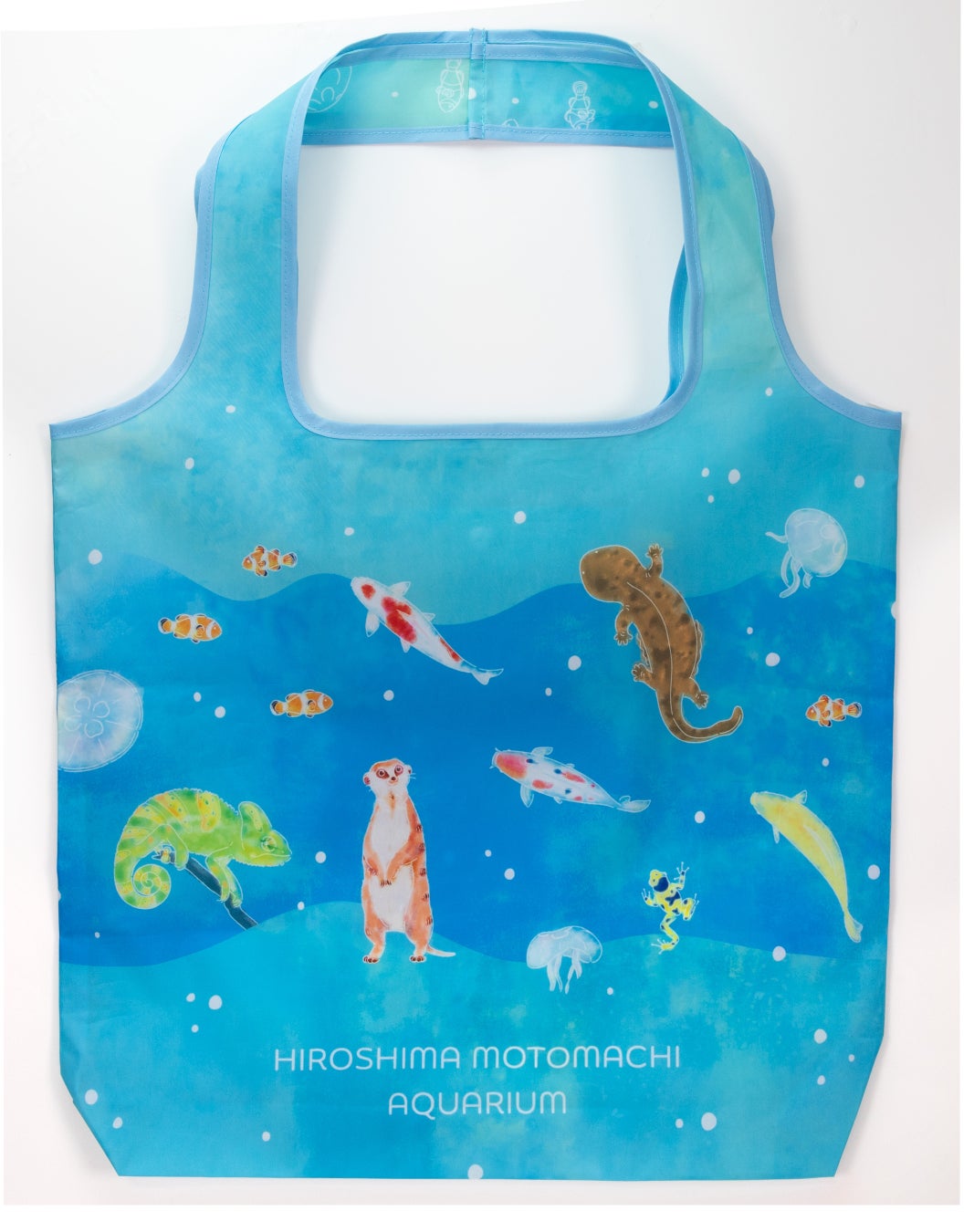 毎日の買い物に使いやすいサイズの水族館オリジナルデザインエコバッグ。海洋ゴミとして回収されたペットボトルを原料にした再生PET繊維を使用しています。
