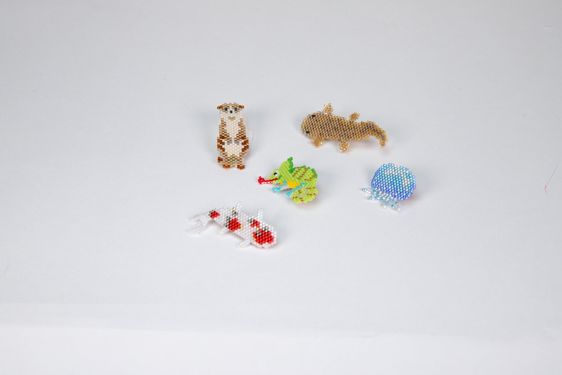 ■ビーズブローチ(ミズクラゲ/エボシカメレオン/ニシキゴイ/オオサンショウウオ/ミーアキャット)