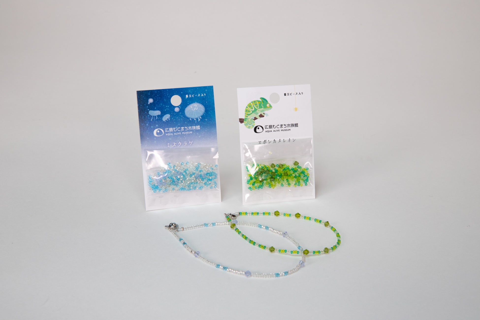 広島のグラスビーズメーカーのトーホー株式会社が作る、誰でも自由にビーズワークが楽しめるビーズキット。広島もとまち水族館限定デザインで、ミズクラゲとエボシカメレオンの色をイメージした、美しいグラスビーズです。