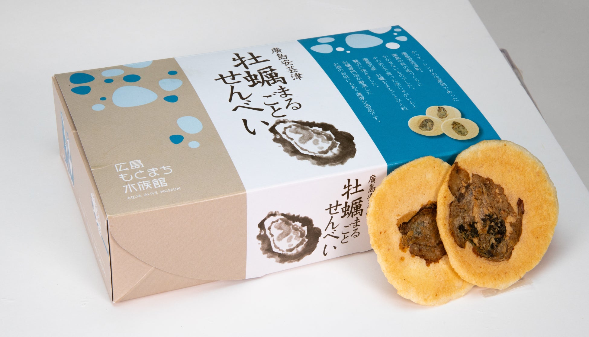 広島県産牡蠣を贅沢にまるごとのせて焼き上げ、生地には広島安芸津町の特産、赤土で育てられたじゃがいも「まる赤馬鈴薯」を使用したお菓子。牡蠣の風味をしっかりと感じられる、お酒のお供にもお土産にも、ぴったりな水族館オリジナルデザイン菓子です。