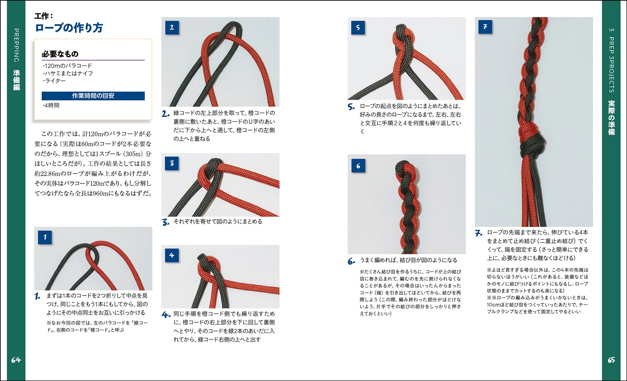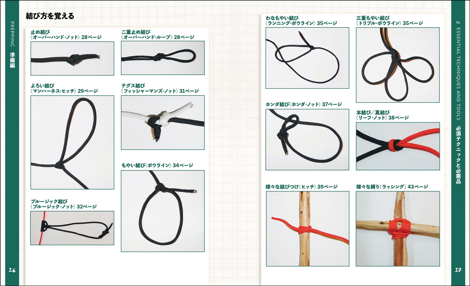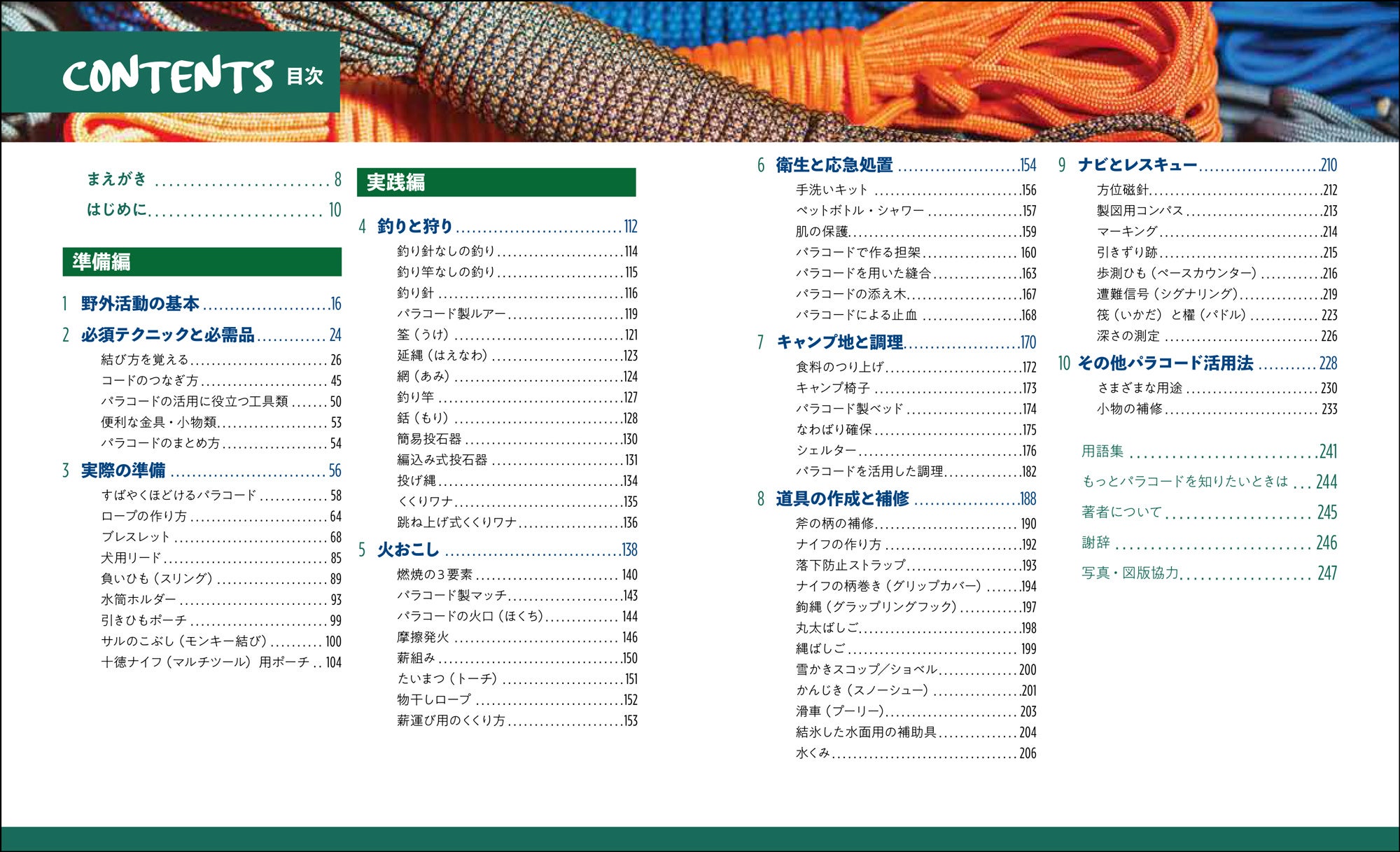 野外活動の基本/必須テクニックと必需品/実際の準備/釣りと狩り/火おこし/衛生と応急処置/キャンプ地と調理/道具の作成と補修/ナビとレスキュー/その他パラコード活用法