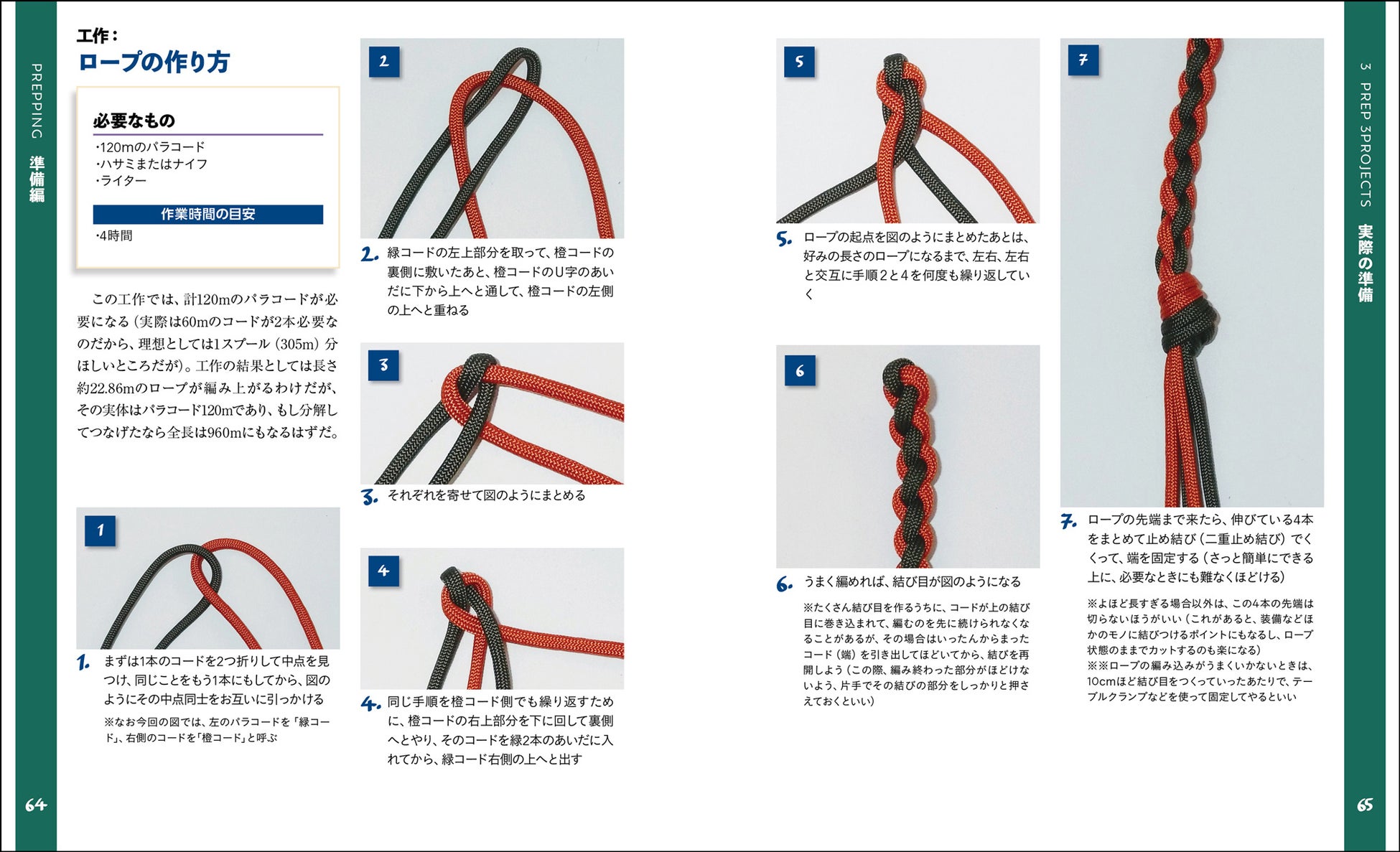 本書は、このパラコードを使ってキャンプやアウトドアで役立つ必須テクニックを紹介する指南本です。前半の「準備編」ではパラコードの基本的な特徴や種類、結び方、ブレスレッドなどクラフトの作り方を紹介。後半の「実践編」では魚釣り、火おこし、湯沸かし、料理、水のろ過など、およそパラコードでは実現不可能に見えるサバイバルテクニックを伝授します。