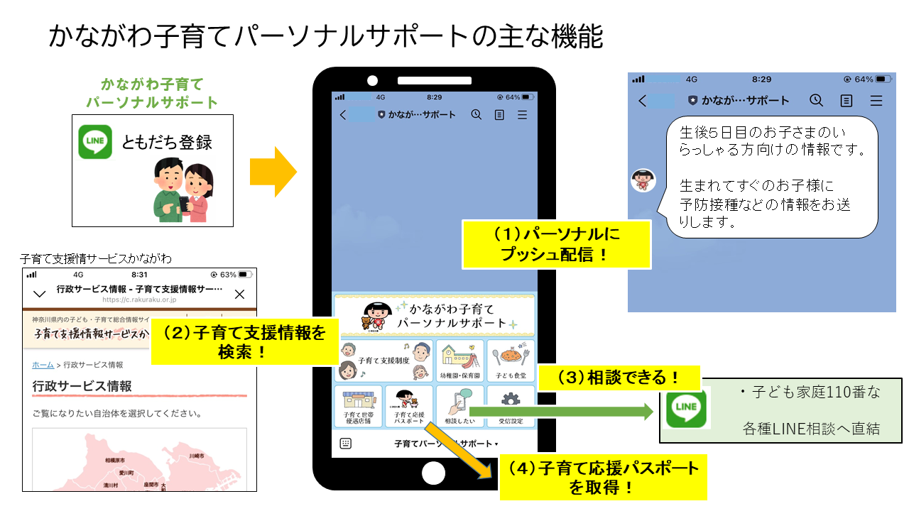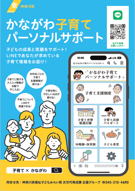 県では、コミュケーションアプリ「LINE」を活用し、子育て中の皆さんやこれから子育てする皆さんが必要とする支援情報を、お住まいの市町村やお子さんの年齢等、一人ひとり異なるニーズに合わせてプッシュ型でタイムリーにお届けする「かながわ子育てパーソナルサポート」を開始します。