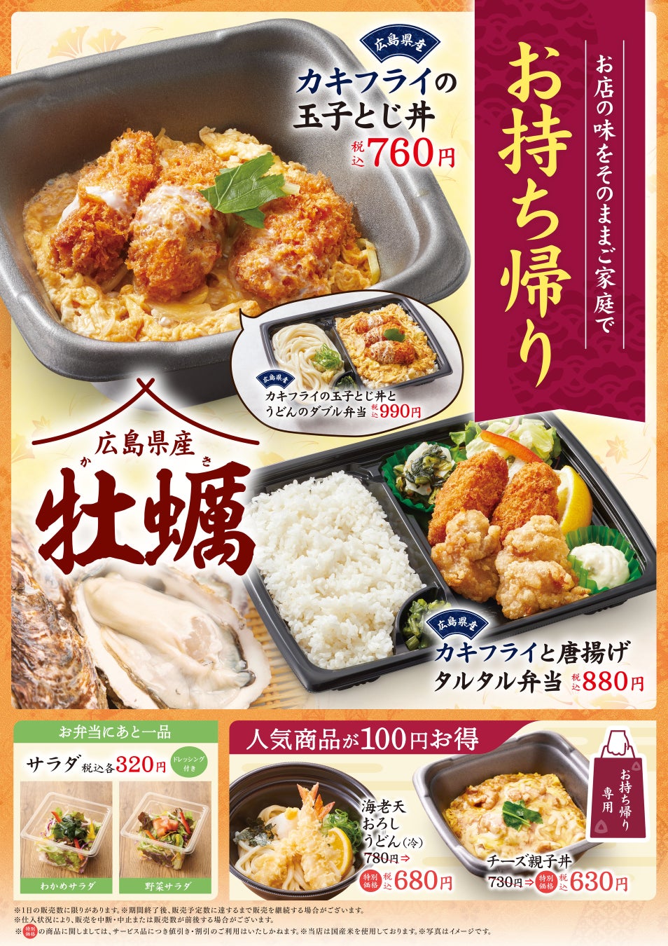 また、テイクアウトでもカキフライメニューを販売します。テイクアウトの人気商品「海老天おろしうどん(冷)」や「チーズ親子丼」が100円お得に購入できます♬