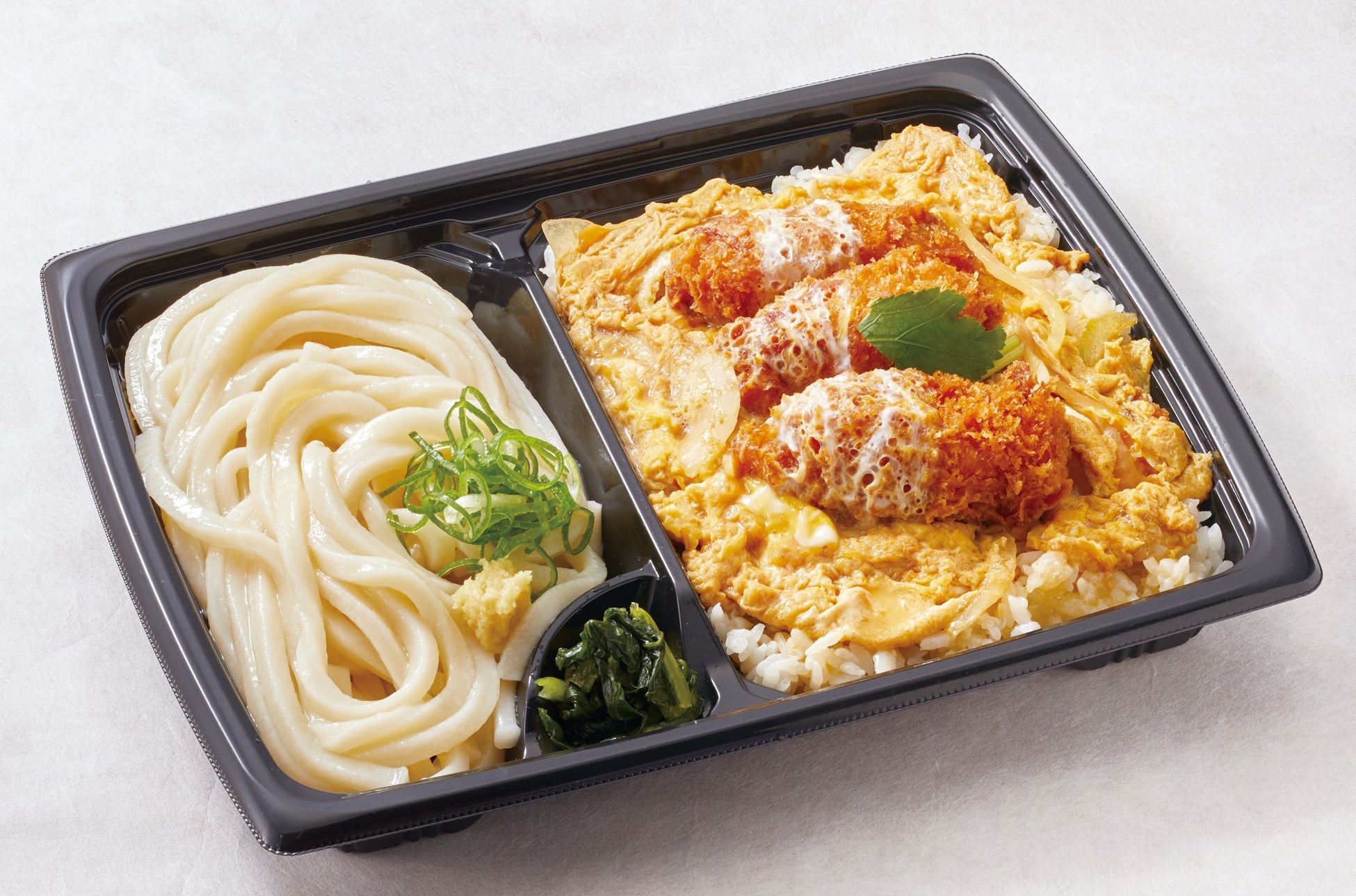 だし香るカキフライの玉子とじ丼と冷たいうどんをダブルで楽しめるボリューム満点の弁当です。