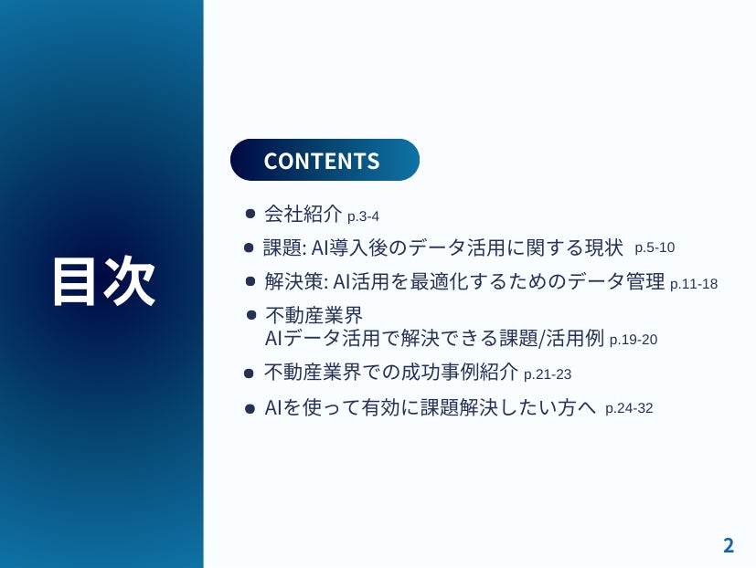 本レポートでは、AIを活用した不動産業界の効率化と競争力強化の成功事例を通じて、空室率の改善や資産価値予測、空き家対策といった課題を解決するための具体的な戦略や実践方法について詳しく紹介しています。
