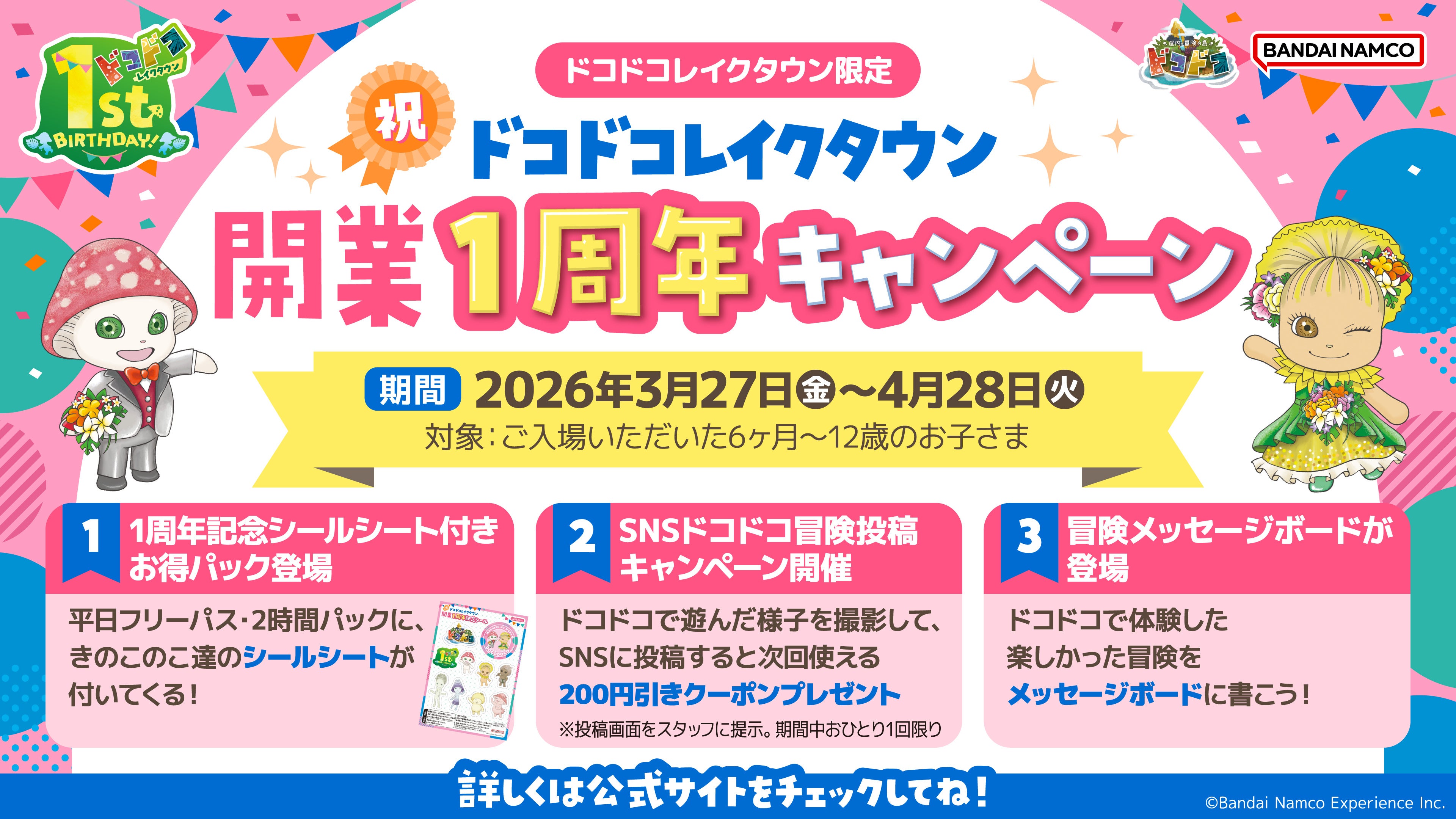 株式会社バンダイナムコエクスペリエンスが企画・プロデュースする子どものあそび場『屋内・冒険の島 ドコドコ イオンレイクタウンmori』(埼玉県越谷市)は、2026年4月に開業1周年を迎えることを記念して、3月27日(金)~4月28日(火)の間、日ごろの感謝をこめた『祝 ドコドコレイクタウン開業1周年キャンペーン』を開催します。