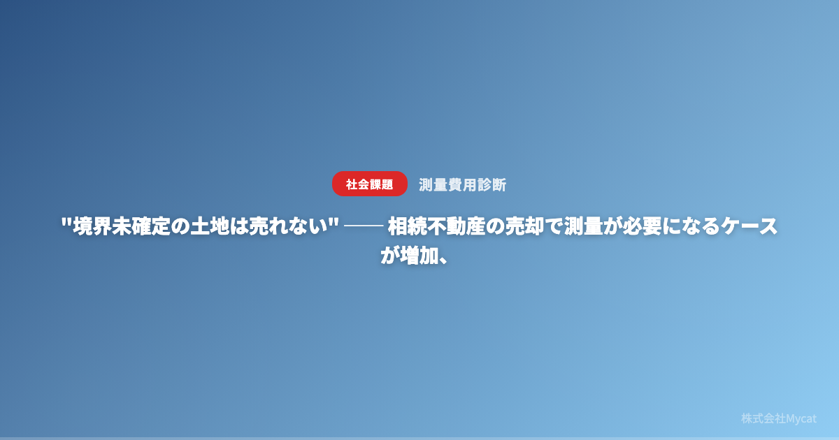 株式会社Mycat(本社:東京都目黒区)は、相続不動産の売却時に測量費用が障壁となっている社会課題を踏まえ、測量費用診断(https://sokuryo.xyz)の費用算出機能を強化したことをお知らせいたします。