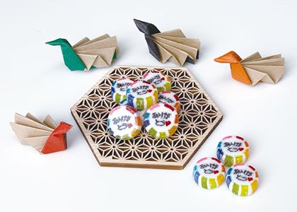 ロビーで忍者がお迎えし、お客様へ組み飴をお配りいたします。