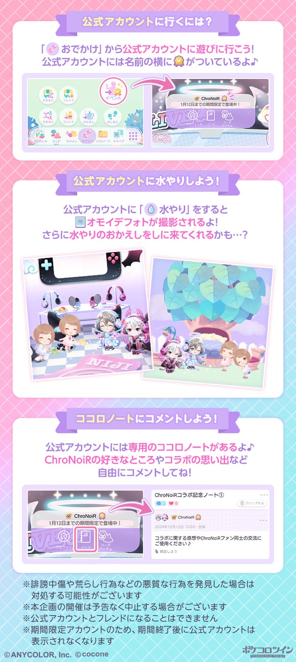 『ポケコロツイン』に期間限定で登場する「ChroNoiR」公式アカウントを訪れると、叶と葛葉の魅力を再現したアバターがいつでもお客様をお出迎えします。さらにココリウムの木に水やりをすると、公式アカウントからお返しの水やりを受けることができ、その瞬間は「オモイデフォト」で撮影されます。今しか体験できない「ChroNoiR」とのコラボで、特別な思い出づくりをぜひお楽しみください。