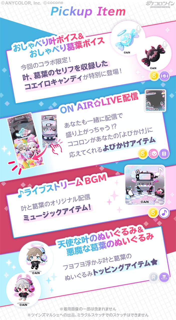 様々なコラボアイテムをゲットしていただくことで、まるで叶と葛葉のふたりと一緒に過ごしているかのような体験を、いつでも、どこでも『ポケコロツイン』でお楽しみいただけます。「ChroNoiR」との時間をさらに充実させることができるこの機会を、ぜひお見逃しなくご体験ください。