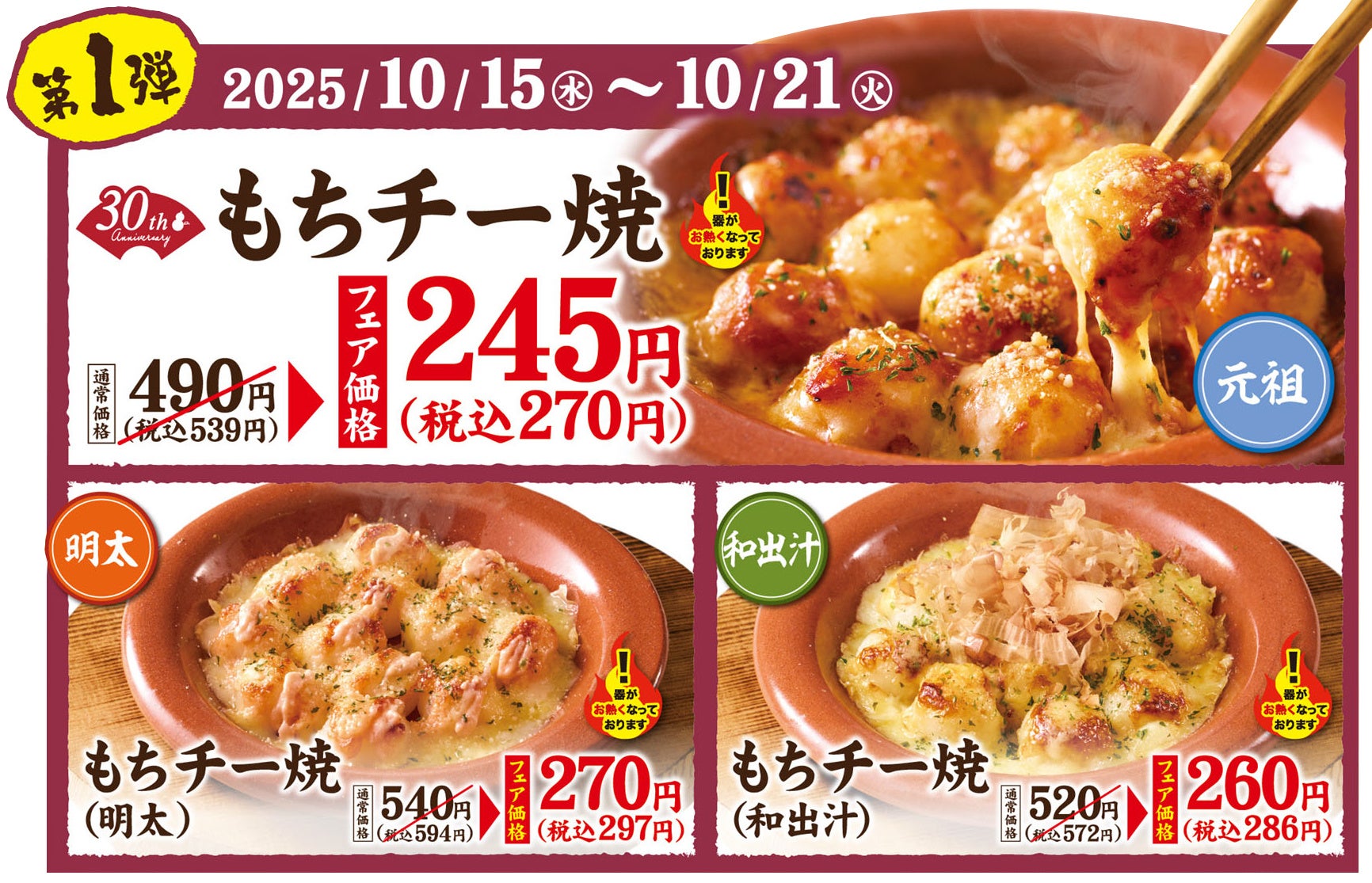 2025年10月15日(水)~ 10月21日(火)の第1弾では、本年30周年を迎えた「もちチー焼」を半額にて販売!更に、30年周年の記念メニューとして10月15日よりラインナップされた「もちチー焼(明太)」、「もちチー焼(和出汁)」も半額にて販売いたします。