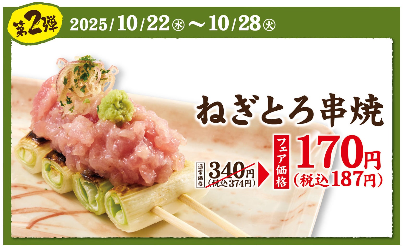 2025年10月22日(水)~10月28日(火)の第2弾では、ねぎも主役と云わんばかりの「ねぎとろ串焼」を販売いたします。