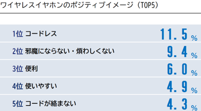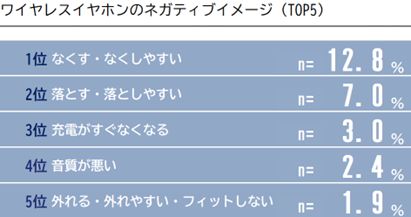 一方で、ネガティブなイメージではワイヤレスイヤホンならではの落とす・無くすが高くでており充電の充電や音質等の具体的な機能面のネガティブイメージが上位に来ています。
