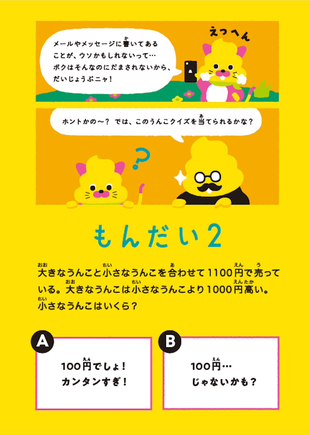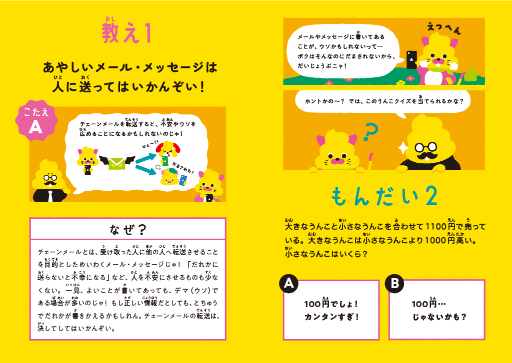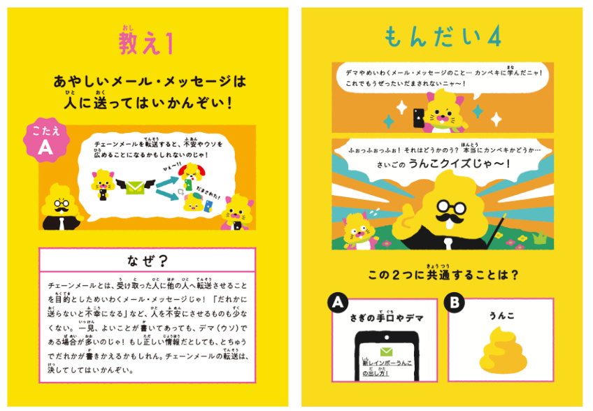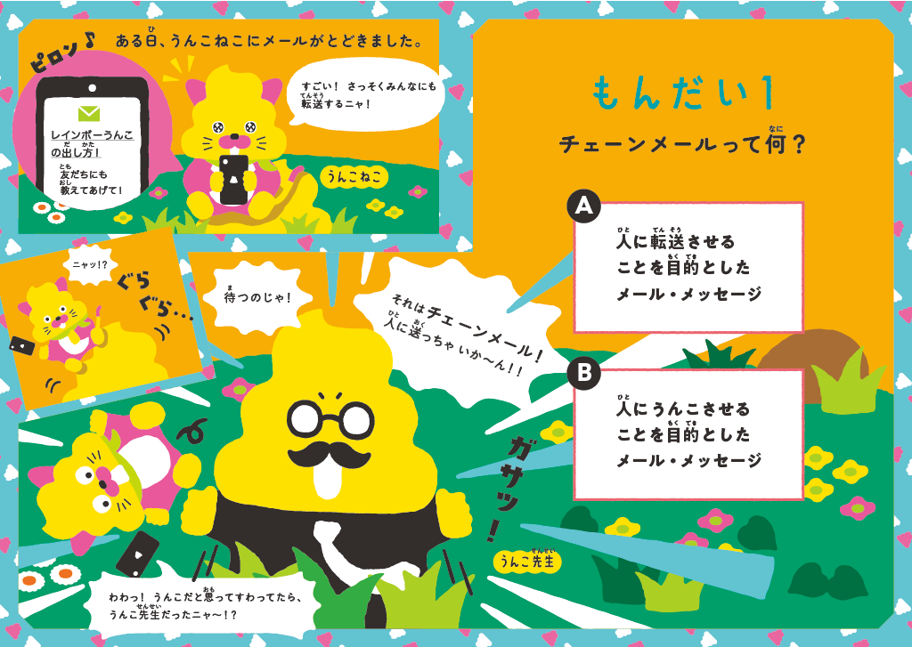 人気キャラクター・うんこ先生から出題される「うんこ」というキーワードがちりばめられたユーモアあふれるクイズの選択肢はもちろん、親しみやすく可愛らしいイラストとテンポよく展開されるストーリーで子どもの興味を惹きつけながら、情報に騙される可能性があるということ、めいわくメールを受け取った時の正しい対処法などについて実際の例も見ながら解説していきます。