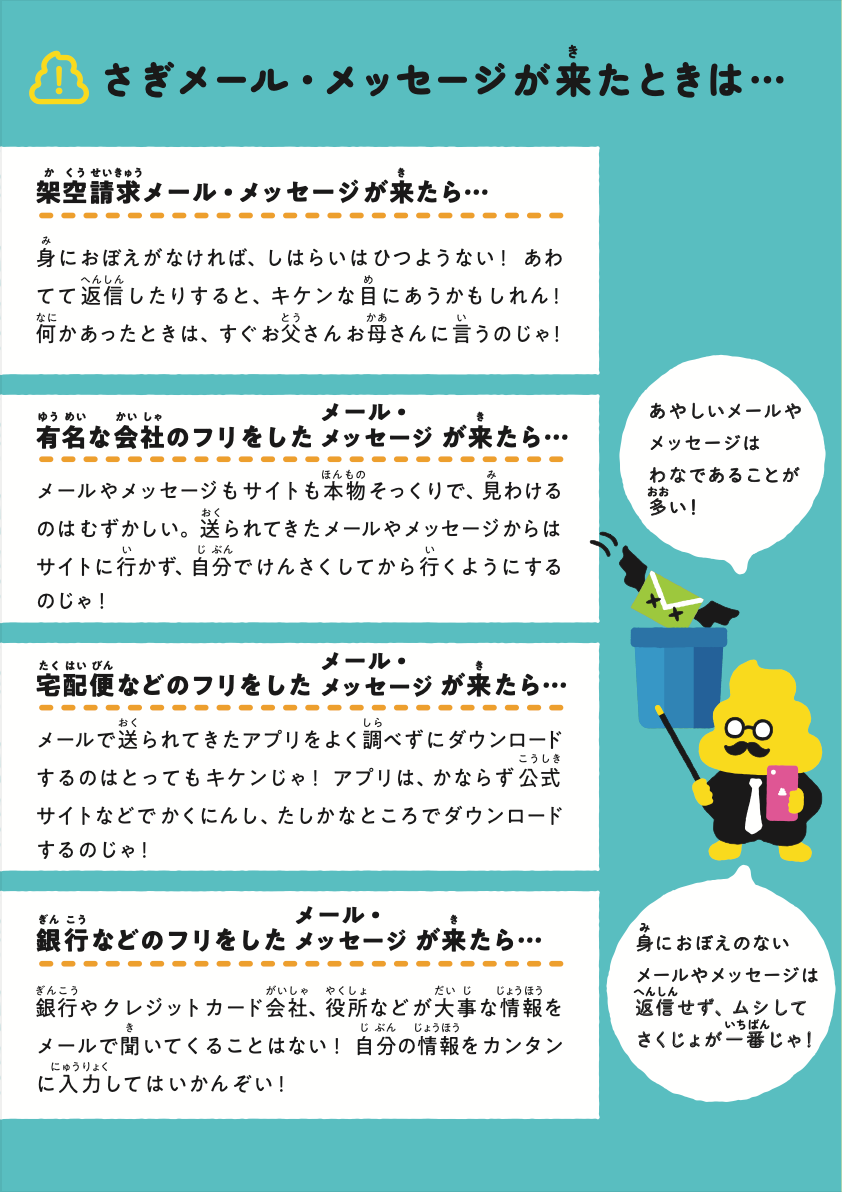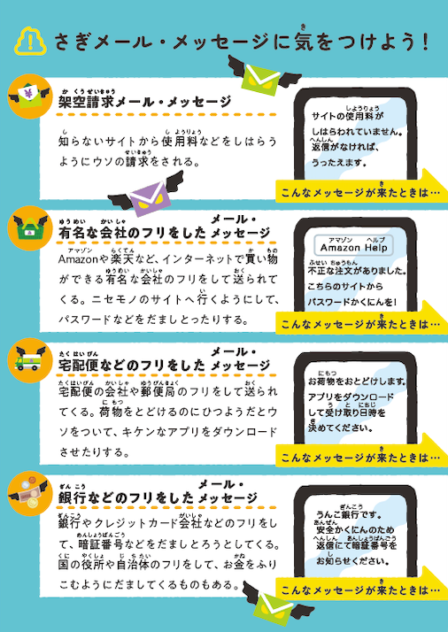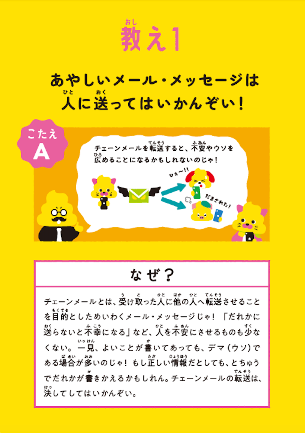 スマホやインターネットと密接に関わる情報化社会において、私たちの身の回りには様々なキケンが潜んでいます。「うんこドリル めいわくメール」は、一人でも多くの子どもたちが詐欺やデマ、めいわくメールに騙されずに上手に情報と向き合ってほしいと言う想いから、累計1,000万部を突破し小学生に圧倒的な認知を誇る「うんこドリル」シリーズと一般財団法人 日本データ通信協会がコラボして制作した冊子。