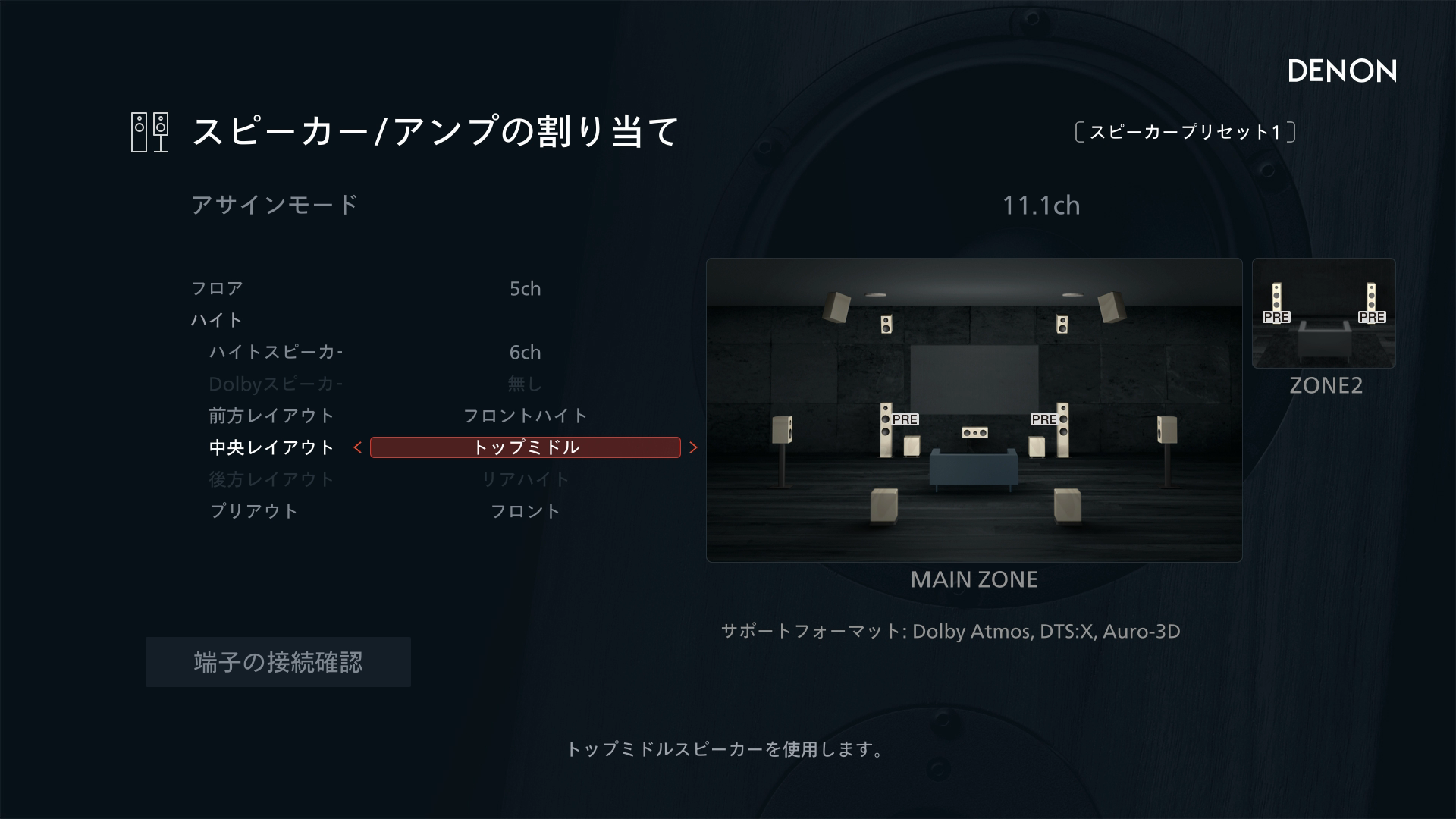 AVR-X4800HはDolby Atmos、DTS:X、MPEG-4 AACに加え、IMAX Enhanced、Auro-3D、およびMPEG-H 3D Audioに対応。9chのアンプを内蔵しており、単体で4chのハイトスピーカーを含むサラウンドシステムを構築することができます。さらに11.4chまでのプロセッシングに対応しているため、外部パワーアンプを追加すれば最大6chのハイトスピーカーを使用することができます。また、最大4台のサブウーファーを接続することができ、それぞれのサブウーハーに近くのスピーカーの低域成分を割り当てることができるため、低音の指向性、移動感も正確に再現することができます。プリアウトは11.4chを装備しており、プリアンプと内蔵アンプを切り離す「プリアンプモード」を使用すれば、内蔵アンプの動作の影響を受けない純度の高い音声信号を外部パワーアンプに出力することができます。プリアンプモードは全チャンネルを一括で切り替えられるだけでなく、チャンネルごとに個別に設定することもできます。