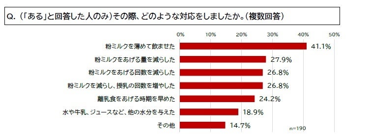39.6%が、経済的な理由により粉ミルクが買えなかった経験が「ある」と回答した。その際の対応として「粉ミルクを薄めて飲ませた」が41.1%と最も多く、次いで「粉ミルクをあげる量を減らした」が27.9%、「粉ミルクをあげる回数を減らした」が26.8%だった。