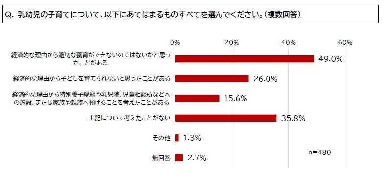 子育ての中で孤独感を感じることが「よくある」が34.8%、「時々ある」が37.5%と、「よくある」「時々ある」を合わせると7割以上が孤独感を感じていることがわかった。また、乳幼児の子育てについては、49.0%が「経済的理由から適切な養育ができないのではないかと思ったことがある」と回答しており、経済的理由による子育て不安が大きいことがわかる。