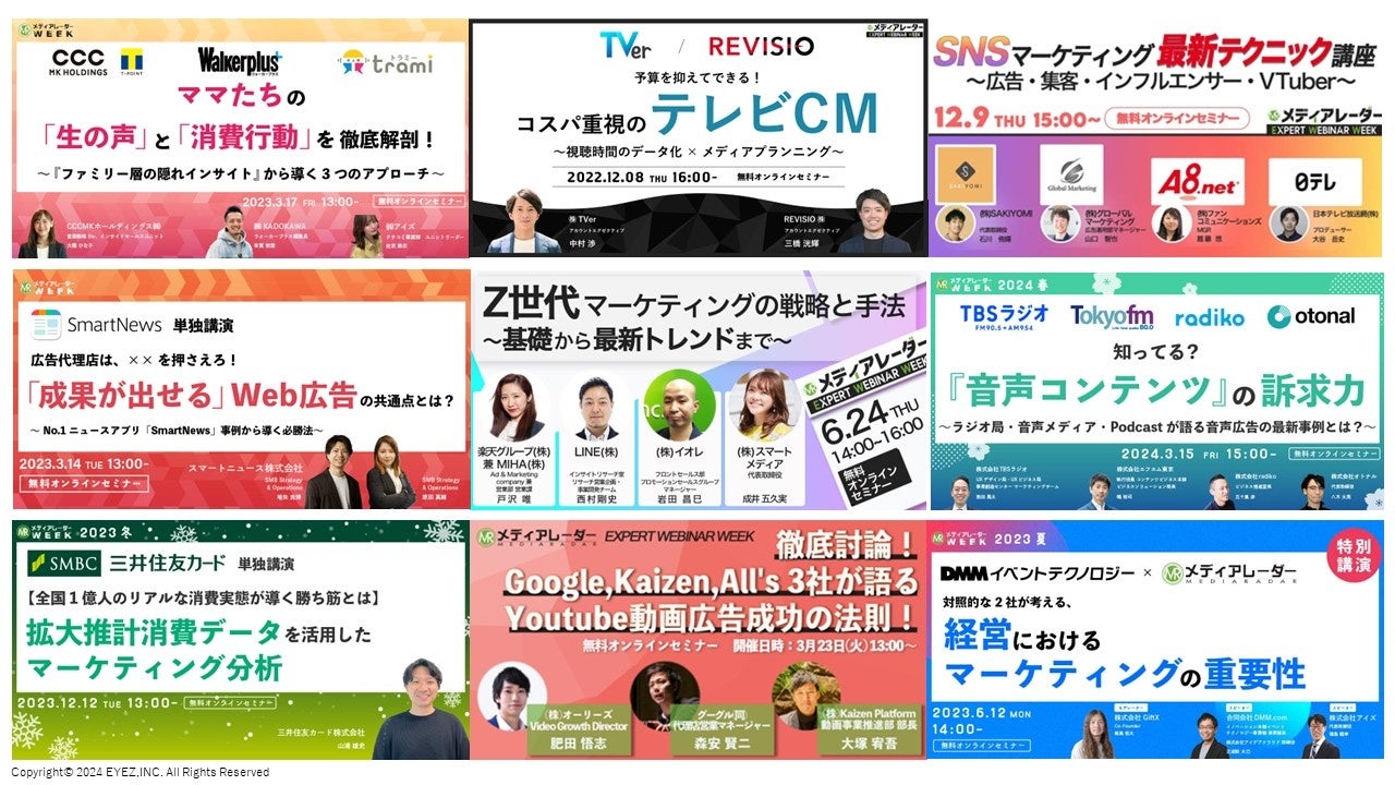広告業界のプラットフォームであるメディアレーダーは、1週間でさまざまな広告・マーケティングジャンルのセミナーを行うオンラインセミナーイベント「メディアレーダーWEEK」を年4回(3月・6月・9月・12月)開催しています。