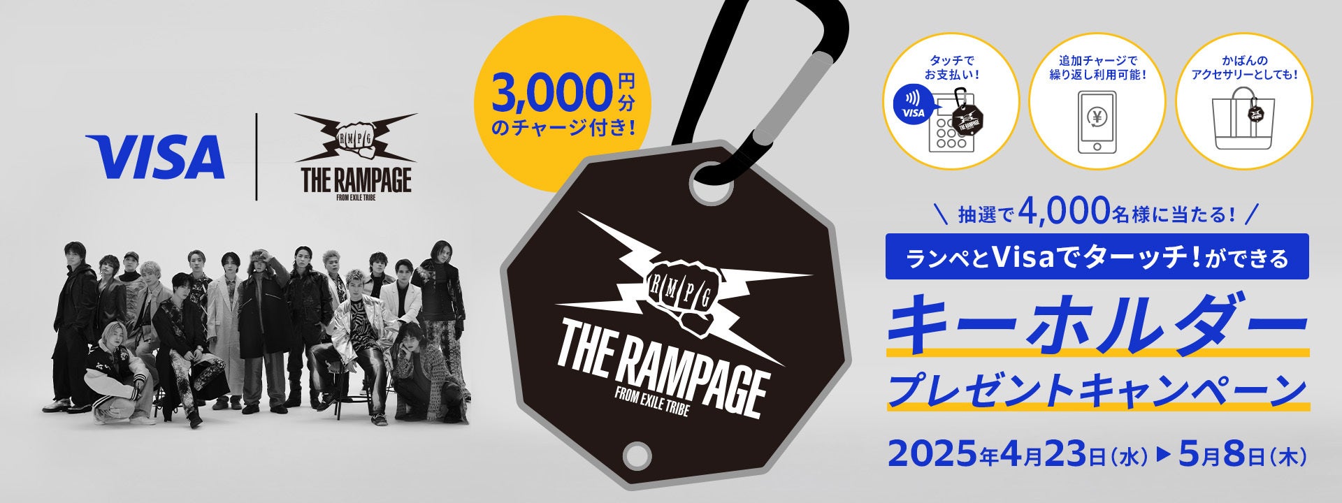 4月23日に公開予定の公式キャンペーン応募ページにアクセスし、所定の項目を入力し応募完了いただいた方の中から抽選で、3,000円がチャージされたVisaのタッチ決済ができるTHE RAMPAGEロゴ入りオリジナルキーホルダーを抽選で4,000名様にプレゼントいたします。