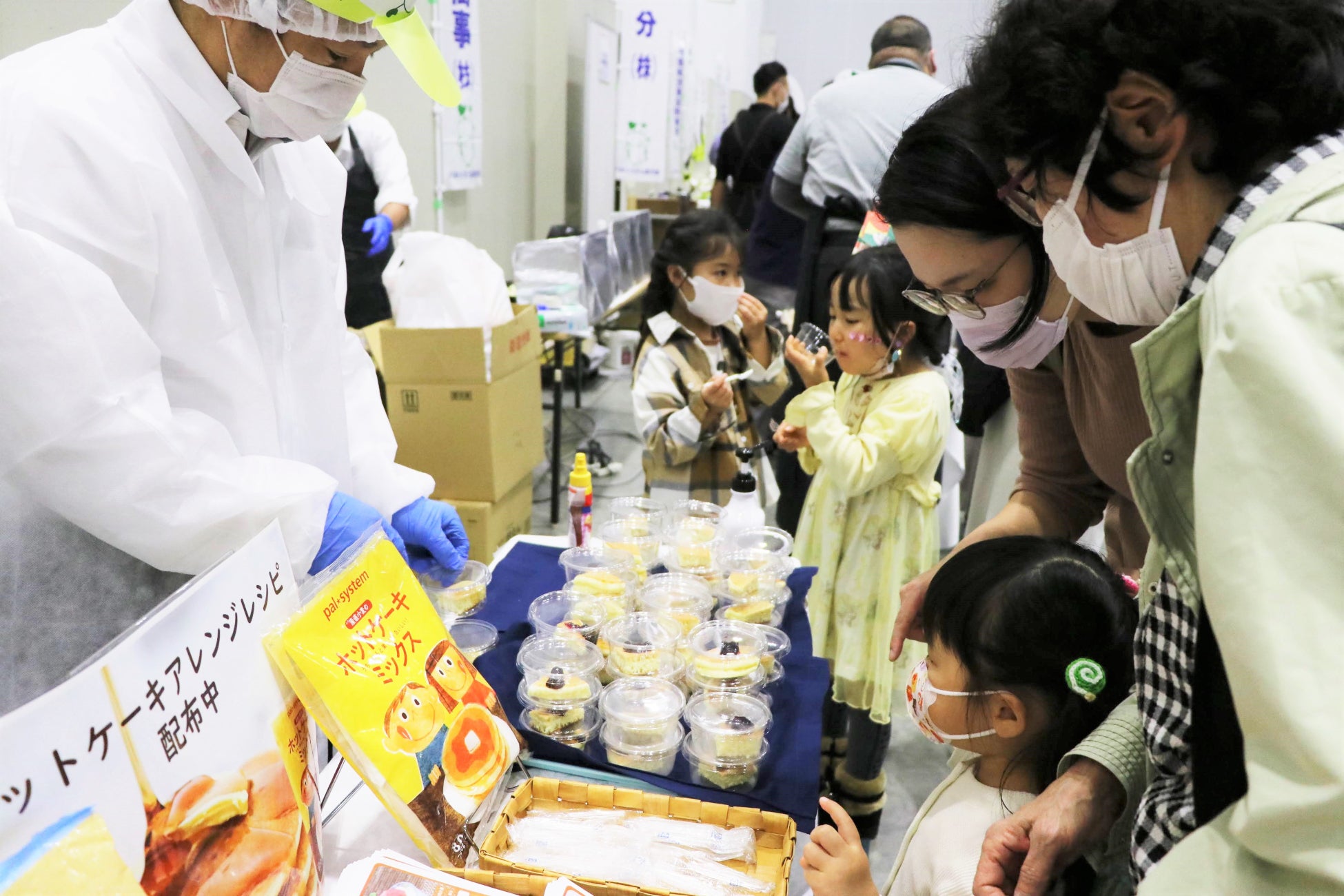 商品展示会は、パルシステム群馬の宅配サービス利用者を無料で招待し、約50社の取引先が商品の試食やサンプル提供をするイベントです。ふだん食べている商品の作り手が、原料のこだわりや生産工程の工夫などを利用者に伝え、商品の感想や感謝の気持ちを直接受け取れる貴重な機会です。