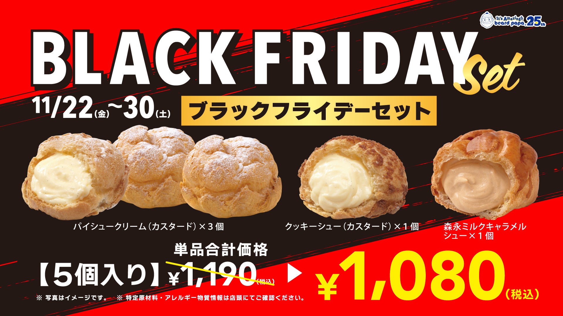 株式会社DAY TO LIFE(本社:大阪府大阪市北区、代表取締役社長:杉内健吉)が展開するシュークリーム専門店ビアードパパにて、2024年11月22日(金)~11月30日(土)の9日間、特別価格の“ブラックフライデーセット”を販売いたします。ブラックフライデーセットは、ビアードパパの定番商品“パイシュークリーム(カスタード)”と、“クッキーシュー(カスタード)”に加え、森永製菓株式会社(本社:東京都港区、代表取締役社長:太田栄二郎)のロングセラー商品“森永ミルクキャラメル”の味わいをシュークリームで再現した話題のコラボレーション商品“森永ミルクキャラメルシュー”も組み合わせた、人気商品計5個を1,080円(税込)で販売する期間限定のお値打ちセット。またビアードパパのモバイルアプリ会員様には、さらにお得に購入いただけるクーポンを配信いたします。25周年を迎えたビアードパパがお届けする“驚き”の美味しさを、ぜひお得なこの機会にお楽しみください。