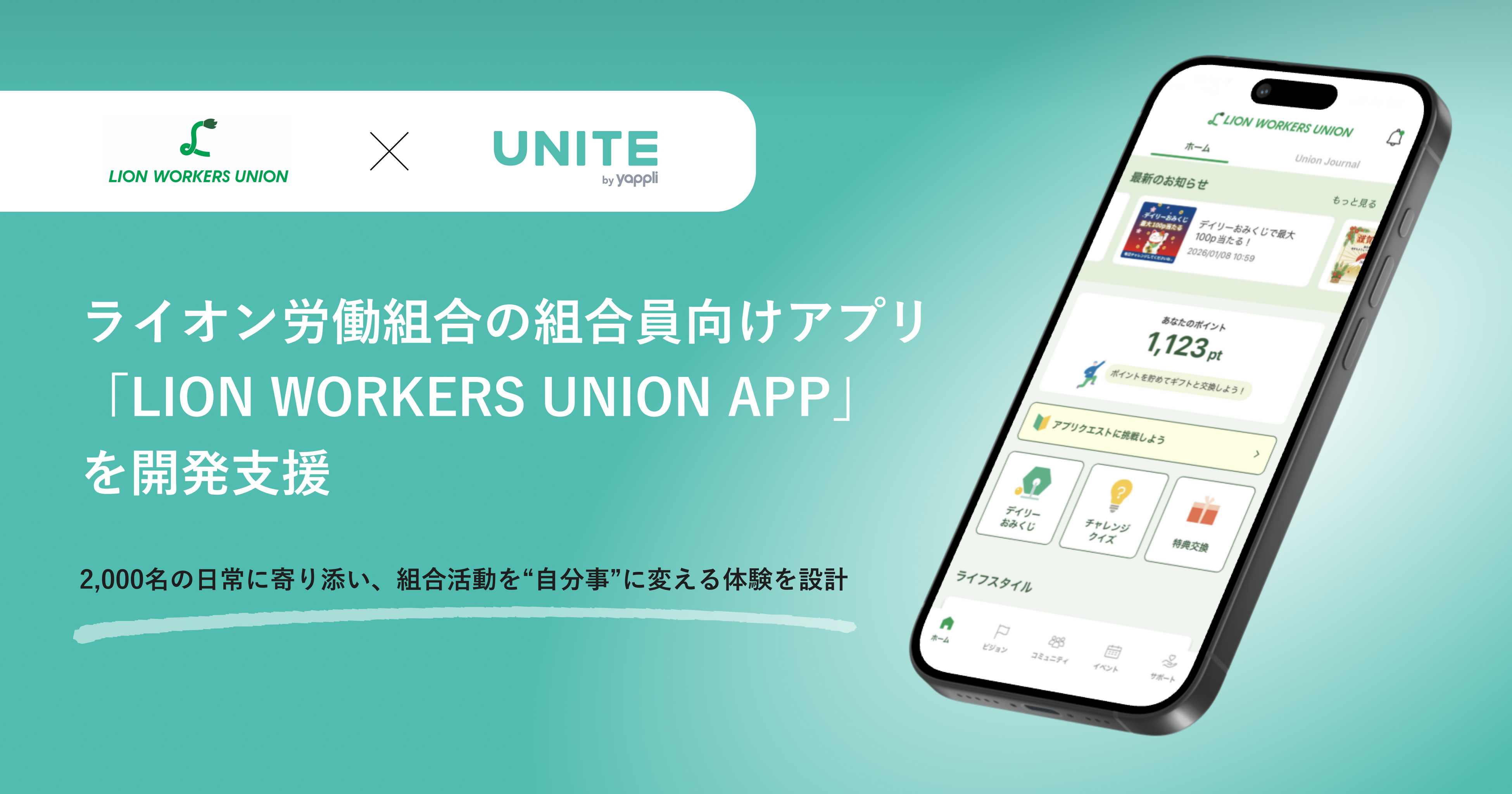 社内エンゲージメントアプリプラットフォーム「UNITE by Yappli」を提供する株式会社ヤプリ(本社:東京都港区、代表取締役:庵原 保文、以下「ヤプリ」)は、ライオン労働組合(本部:東京都、中央執行委員長:千葉陽司、以下「ライオン労組」)の組合員向けアプリ「LION WORKERS UNION APP」の開発を支援したことをお知らせいたします。