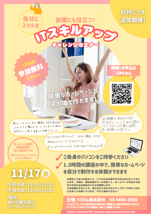 【参加受付中】栃木市でWebサイト制作セミナーを無料開催 11/17(金) 〜地方で育児中の女性のリスキリングのきっかけとしてベビカムが主催〜