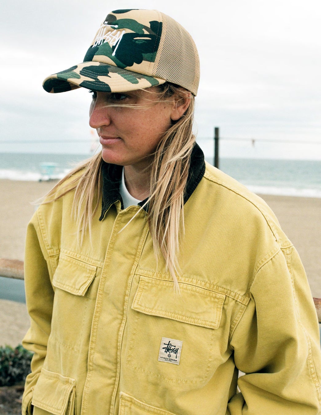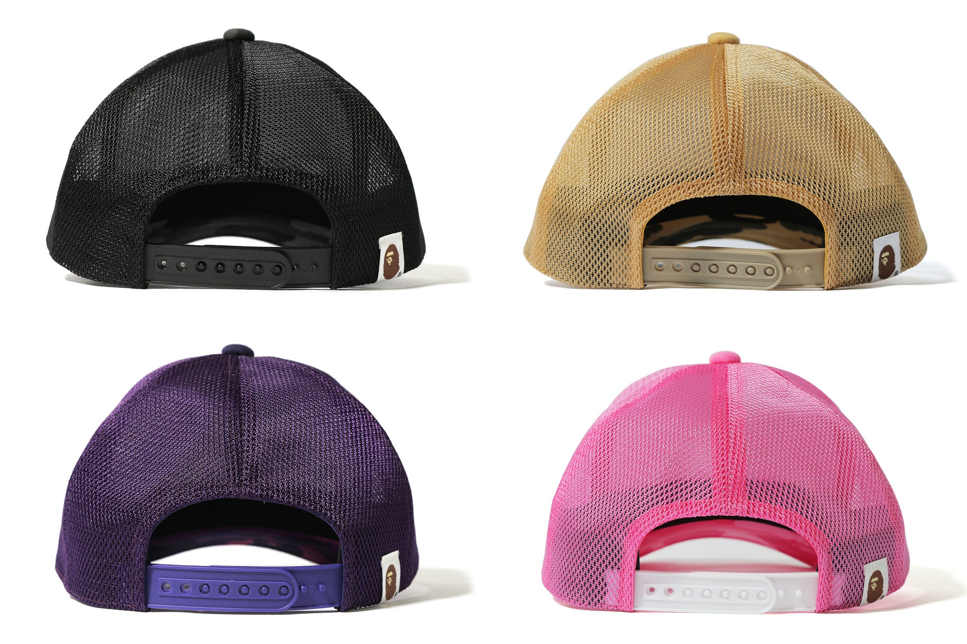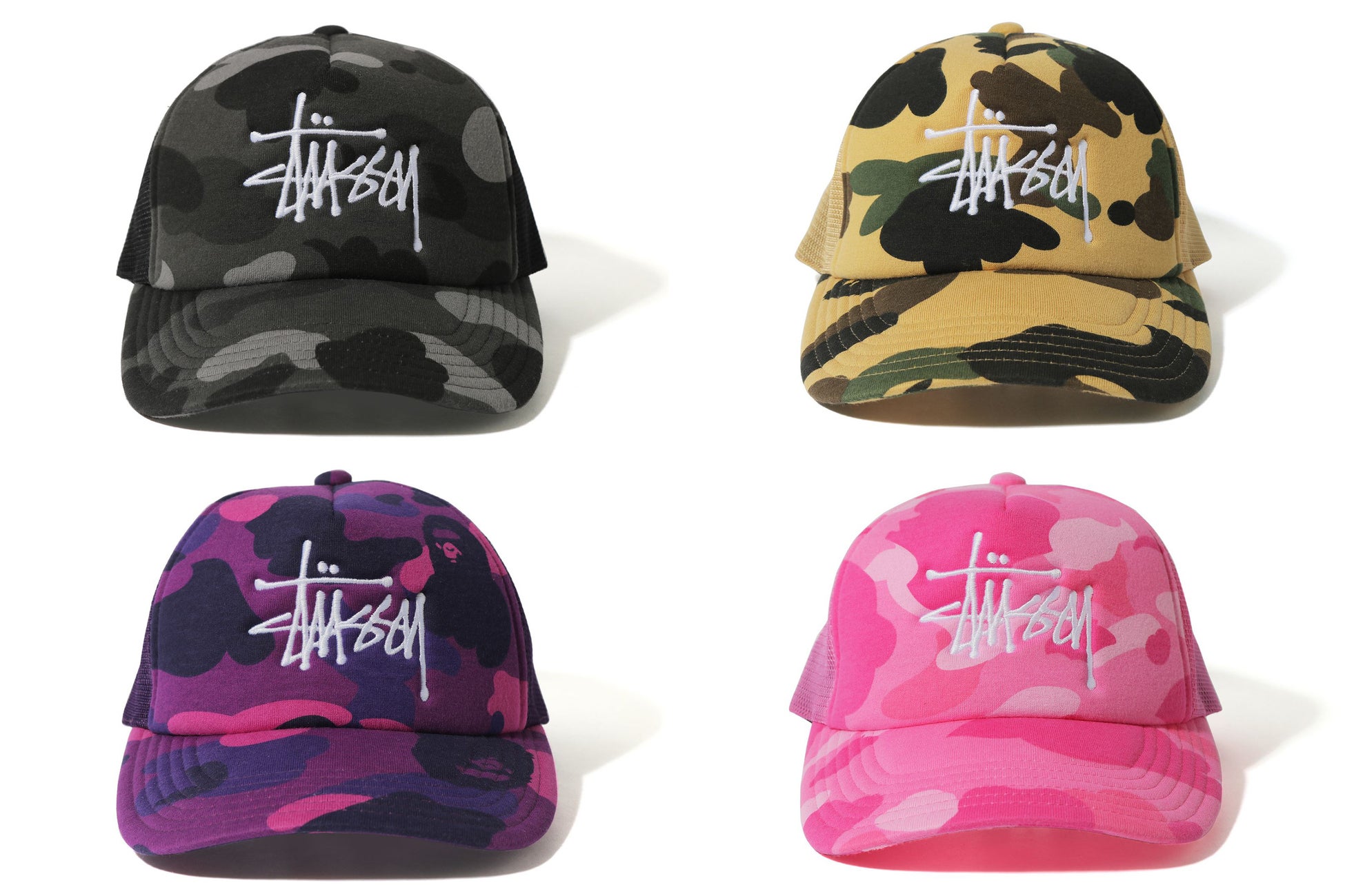 ブラック、イエロー、ピンク、パープルの4色展開で、フロントにはStüssyのブランドロゴ、バックにはBAPE®のピスネームが施されています。
