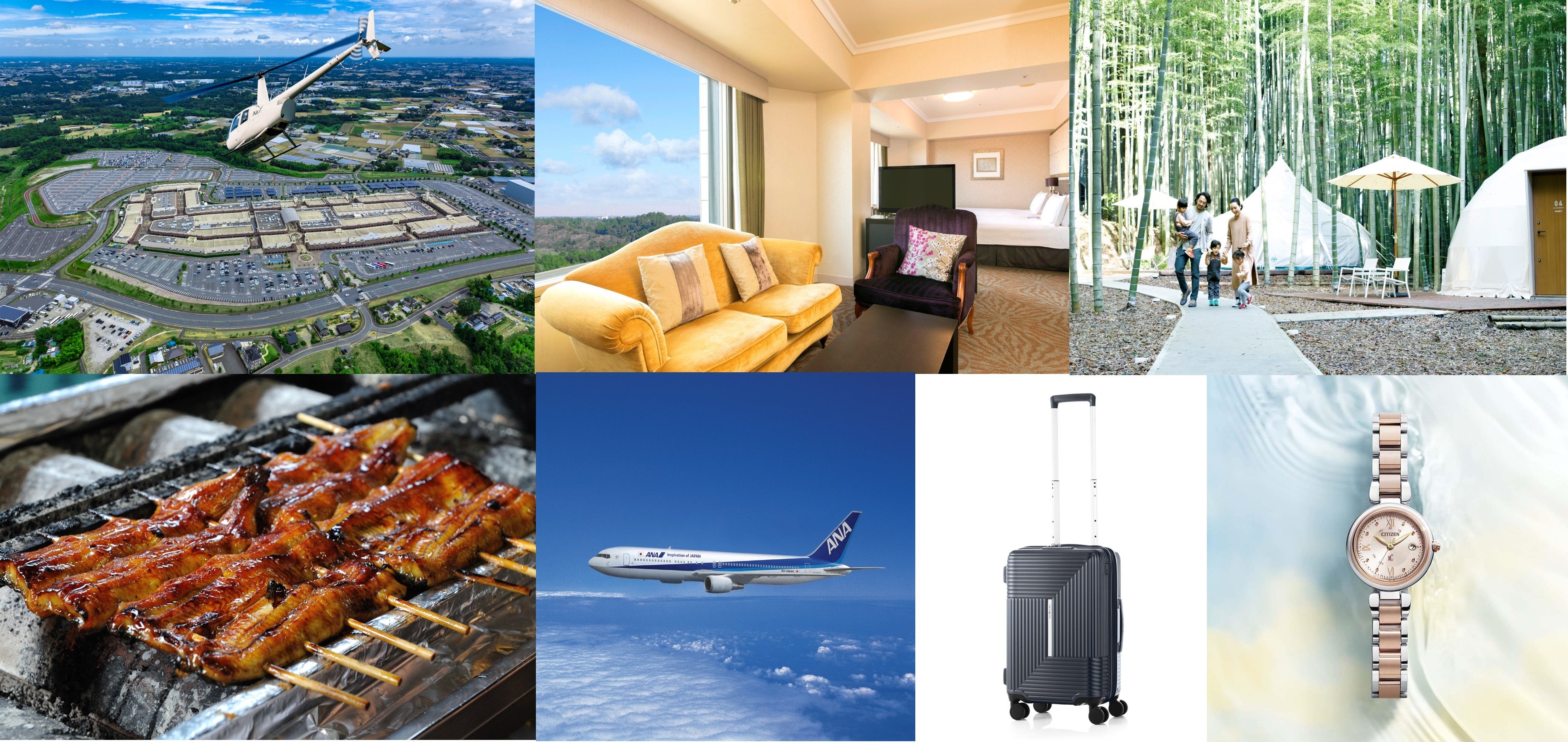 酒々井プレミアム・アウトレットならではの遊覧ヘリクルージング体験や、「ヒルトン成田」などのエリアで人気の宿泊体験、8万円分の「ANA」旅行券など、お出かけや旅行を応援する賞品に加え、老舗うなぎ専門店「川豊」のうなぎ蒲焼セットや、千葉県産伊勢海老など、ご当地グルメやグッズもご用意しました。さらに、「Samsonite」や「Citizen」をはじめとした様々な人気ブランドアイテムにもご応募いただけます。