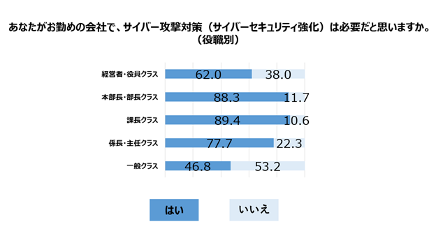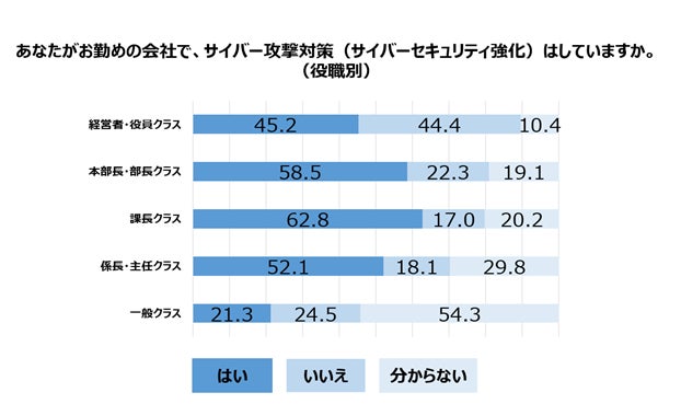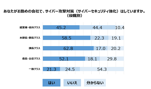 経営者・役員クラスで45.2%、本部長・部長クラスで58.5%、課長クラスでは62.8%、係長クラスでは52.1%、一般クラスで「はい」と答えた人は21.3%で、「わからない」と回答した人が2分の1以上の54.3%と、自社のサイバーセキュリティ対策事情について知らない人が多いことが分かりました。