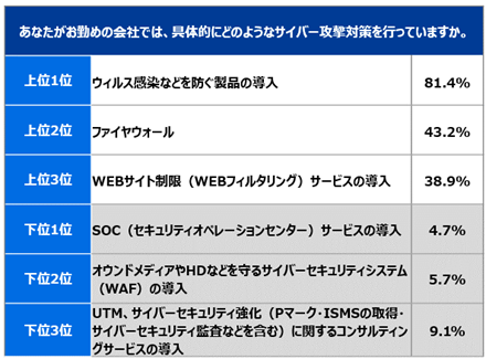 「あなたがお勤めの会社では、具体的にどの様なサイバー攻撃対策(サイバーセキュリティ強化)を行っていますか」という質問に対して、 上位の回答は①ウィルスなどを防ぐ製品の導入が81.4%、②ファイヤーウォールが43.2%、③WEBサイトの制限が38.9%となりました。