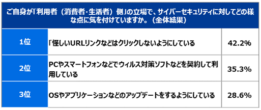「ご自身が『利用者(消費者・生活者)側』の立場で、サイバーセキュリティに対してどの様な点に気を付けていますか」という質問では、最多の回答が①「怪しいURLリンクなどはクリックしないようにしている」42.2%、②「PCやスマートフォンなどでウィルス対策ソフトなどを契約して利用している」35.3%、③「OSやアプリケーションなどのアップデートをするようにしている」28.6%という結果になりました。