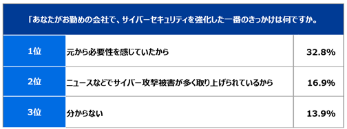 「あなたがお勤めの会社で、サイバーセキュリティを強化した一番のきっかけは何ですか」という質問に対して、全体では「元から必要性を感じていた」と答える人が32.8%、次いで多かったのが「ニュースなどでサイバー攻撃被害が多く取り上げられているから」が16.9%、「分からない」が13.9%でした