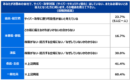 また、役職別に最多の回答を見てみると、経営者・役員クラスでは「サイバー攻撃に遭う可能性が低いと考えている」が5人に1人(23.7%)という結果になり、それ以外の役職では、本部長・部長クラスは「どの様に備えなければいけないのか分からない(16.7%)」「権限がない・提言する立場にない/なぜしていないかわからない(16.7.%)」、課長クラス(30.0%)・係長・主任クラス(41.4%)・一般クラス(60.4%)では「権限がない・提言する立場にない/なぜしていないかわからない」という結果になりました。