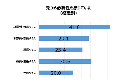 役職別にみると、経営者・役員クラスでは「元から必要性を感じていた」が約半数(41.6%)で最多の回答となりました。一般クラス以外の役職でも同様で、本部長・部長クラスは29.1%、課長クラスで25.4%、係長・主任クラスで30.6%、一般クラスで20.0%という結果になりました。