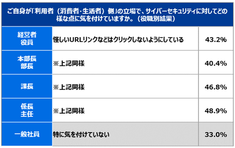 役職別に見てみると、係長・主任クラス以上では「怪しいURLリンクなどはクリックしないようにしている」が最も意識している対策で、経営者・役員クラスで43.2%、本部長・部長クラスで40.4%、課長クラスで46.8%、係長・主任クラスで48.9%の結果となりました。一般クラスでは「特に気を付けていない」が33.0%で最多の回答となり、私生活においても役職によってサイバーセキュリティマインドの差があることが明らかになりました。