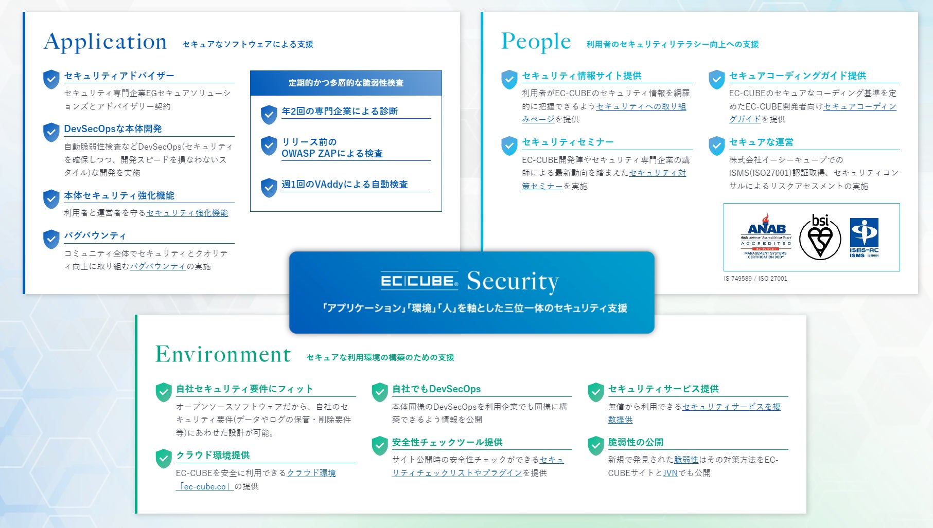 EC-CUBEでは、徹底した情報公開方針のもと、絶えず変化するコンプライアンスニーズや自社のセキュリティ要件に合わせたセキュアな事業運営をしていただけるよう、「アプリケーション」「環境」「人」を軸とした三位一体のセキュリティ支援を行っています。