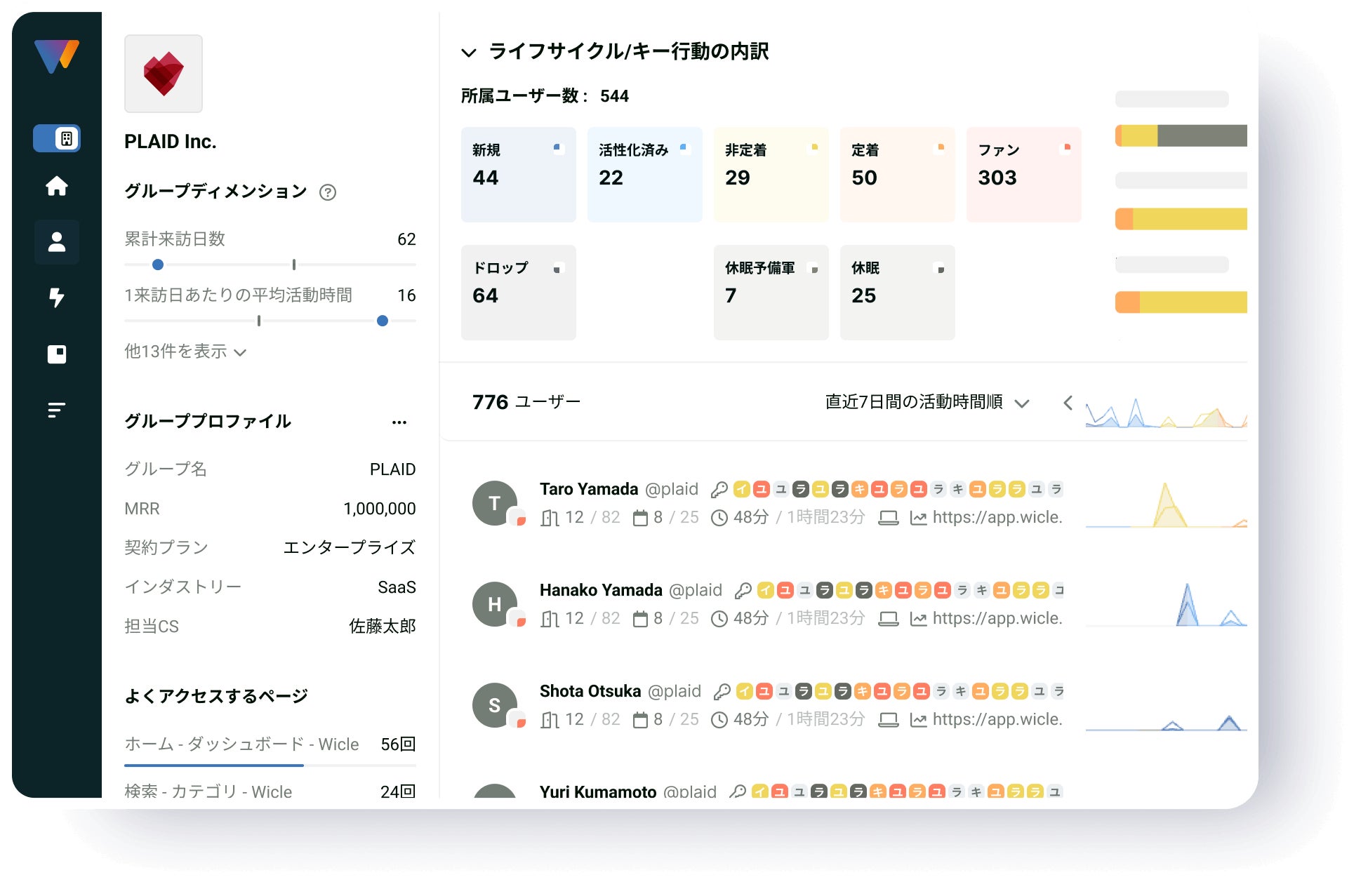 Wicleが自動で可視化する「ライフサイクル(ユーザーの定着率をフェーズ別に定量化)」や「n1行動データ」に加え、本機能で取得可能になった「企業単位での行動データ」を活用することで、企業全体のヘルス状況に基づいたプロダクト改善と効果的なカスタマーサクセス体制の構築が実現します。