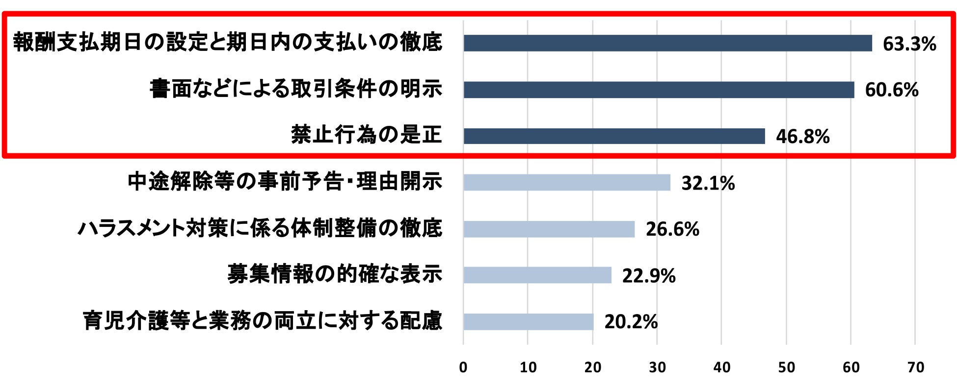 4.施行内容で最も評価する項目は「報酬支払期日の設定と期日内の支払いの徹底」、次いで「書面などによる取引条件の明示」、「禁止行為の是正」となり、金銭トラブルを解決する項目を評価する傾向に。