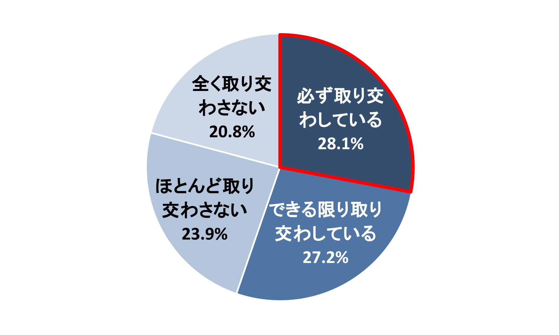 さらにQ2で「取引先と契約書を取り交わしているか」を聞いたところ、「必ず取り交わしている」が28.1%とわずか3割未満ということが明らかになりました。
