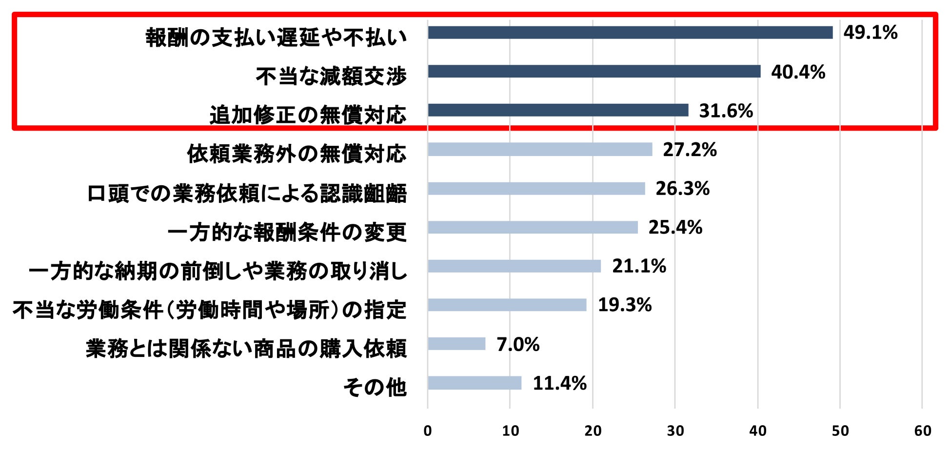 2.トラブル内容のTOP3は、1位「報酬の支払い遅延や不払い」、2位「不当な減額交渉」、