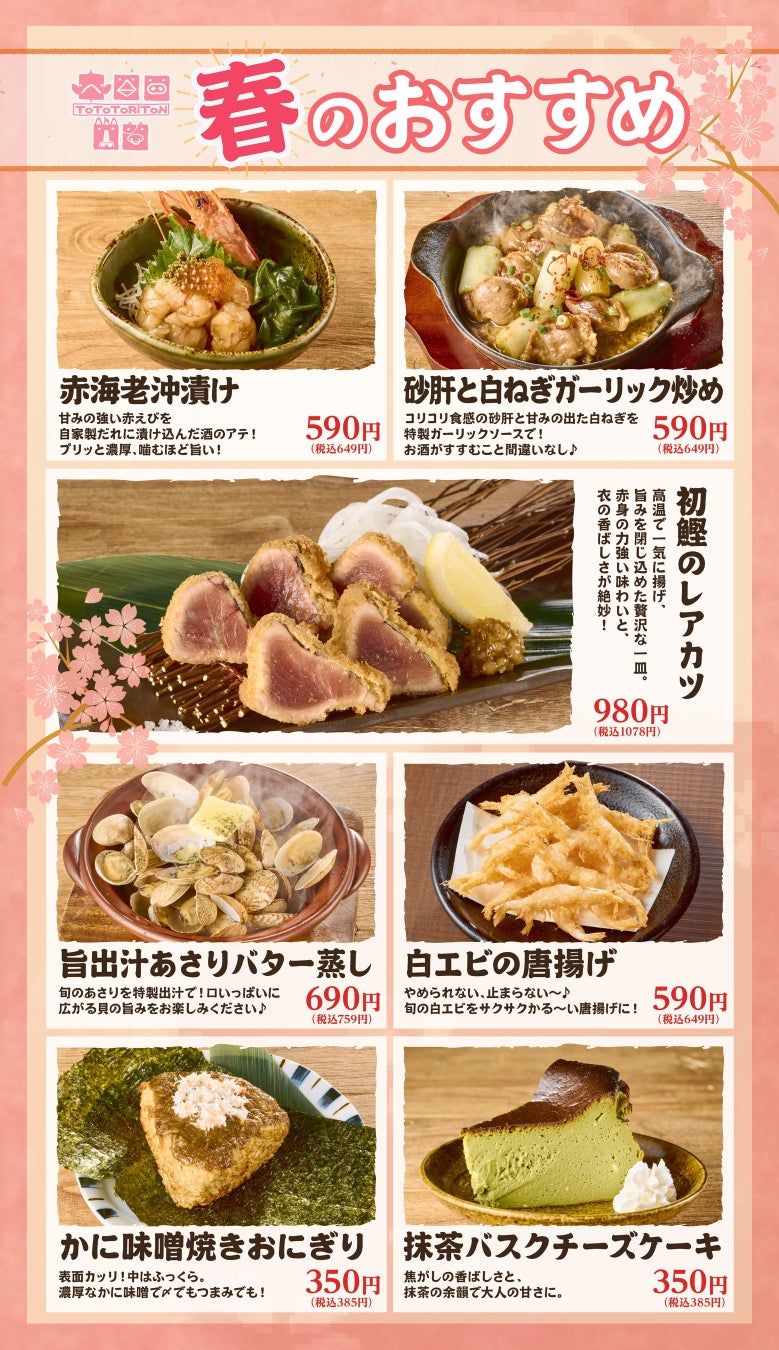 「"楽しい"でつながる世界をつくる」を経営理念とする飲食企業の株式会社ファイブグループ(本社:東京都武蔵野市 代表取締役社長:坂本憲史 以下ファイブグループ)が展開する居酒屋ブランド「とととりとん」は、2026年3月10日(火)より全6店舗にて、春の期間限定メニューの販売を開始いたします。